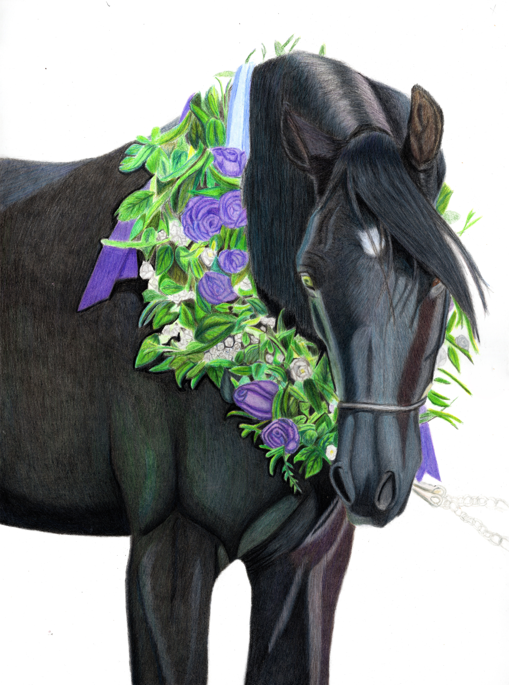 This stunning drawing shows a gorgeous black horse looking like it’s ready to win best dressed at the fanciest horse party ever! The horse is rocking a beautiful flower garland around its neck, bursting with deep purple roses, fresh green leaves, and delicate white blossoms. To top it off, there are elegant purple ribbons tied into the mix for extra flair—like a fashionable bowtie, but way cooler.