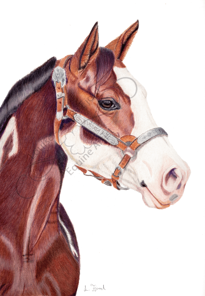 This colorful and detailed drawing features a gorgeous horse with personality to spare! The bay colored beauty proudly shows off its flowing dark mane and striking white blaze that runs right down its face like a splash of paint. You can almost hear the horse snort or flick its ears—it looks so lifelike!