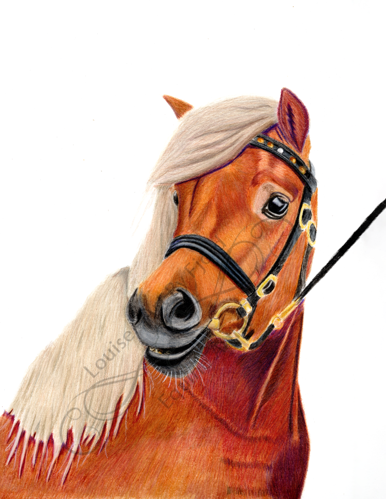 Sure! This drawing bursts with personality! It’s a proud, spirited horse, showing off its luscious golden mane like it knows it’s the star of the show. The deep reddish-brown coat practically glows, giving the horse a warm and inviting vibe. Those shiny golden accents on the bridle? Pure equine fashion! And that cheeky expression—slightly tilted head and wide, curious eye—makes it look like the horse is ready for a playful adventure or maybe a sassy comeback. This masterpiece feels like the horse is saying, “Take a picture; I’m fabulous!”