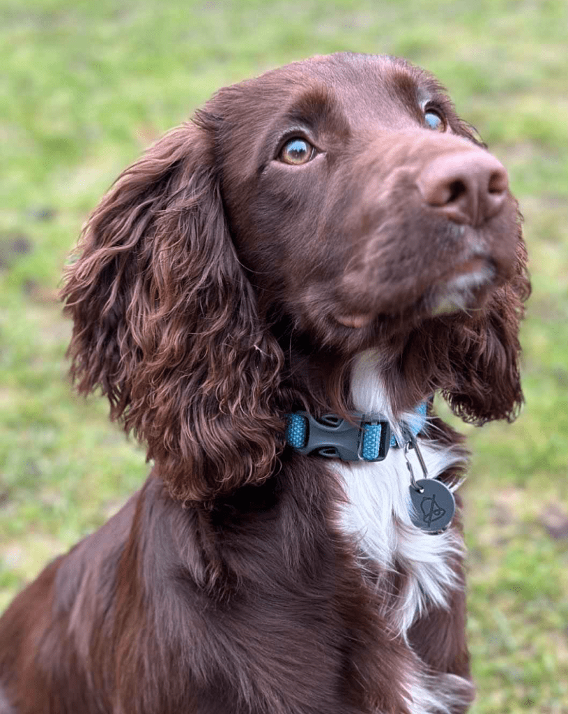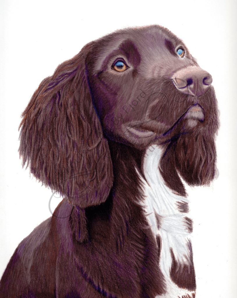 This is a detailed drawing of a dog, likely created using colored pencils or a similar medium. The artwork showcases a realistic portrayal of a spaniel-like breed, characterized by its floppy ears, expressive eyes, and wavy fur. The artist used a combination of warm brown, reddish, and white tones, paying close attention to texture and light to create depth and realism.