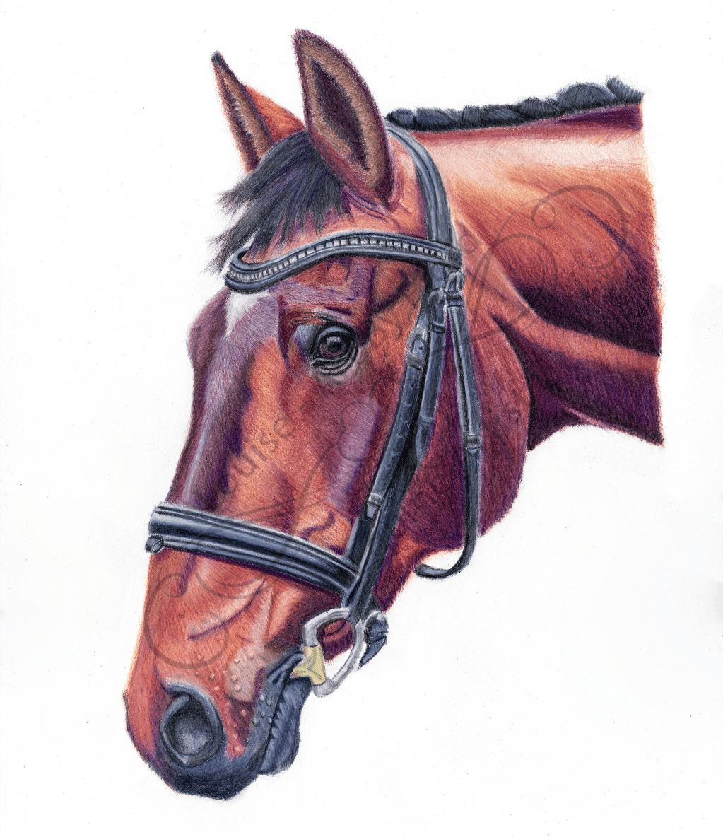 This drawing is a lively and vibrant depiction of a horse’s head, bursting with character and charm! The artist has skillfully blended rich shades of brown, orange, and even purple to create a shimmering, almost magical coat that seems to glow. The horse’s eye sparkles with personality, drawing you in like it has a story to tell. The bridle, sleek and polished, contrasts beautifully with the warm tones of the horse, adding a touch of elegance. With its detailed textures and bold colors, this drawing feels like the horse could just neigh and trot off the page at any moment!